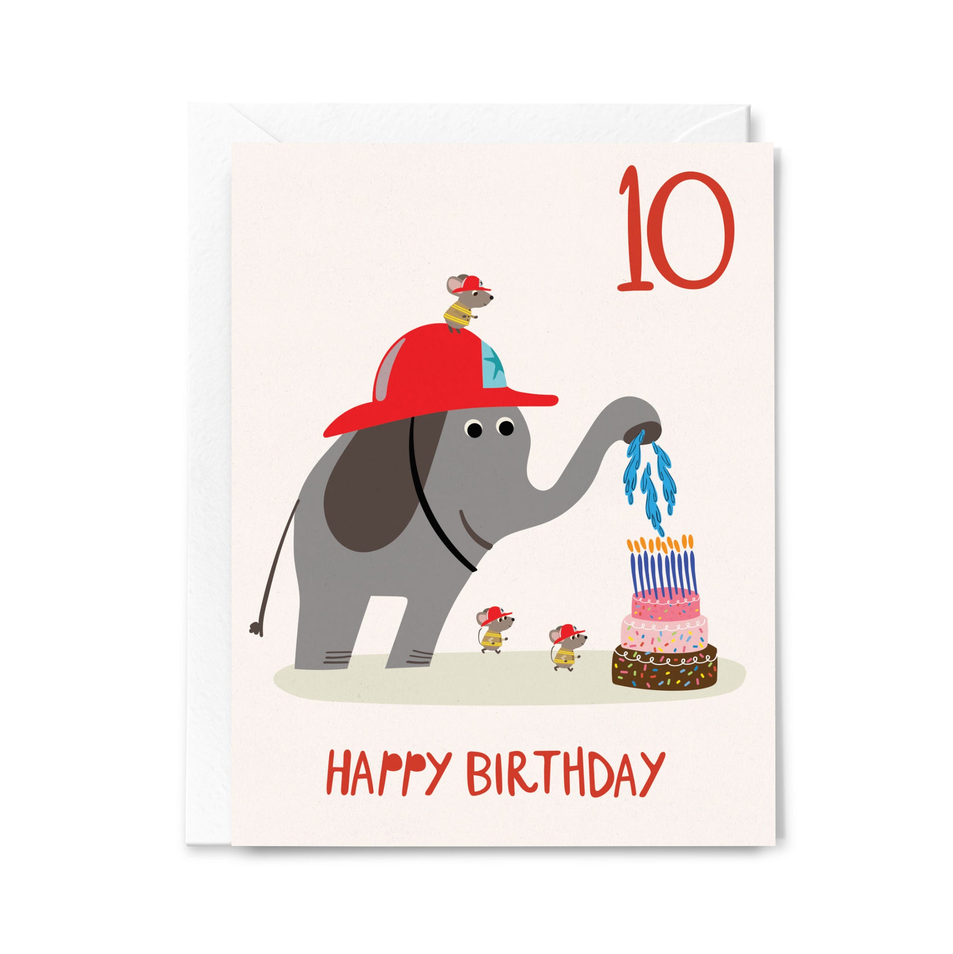 Welcome to double digits! This Number 10 Birthday Card features a friendly elephant dressed as a firefighter, with a tiny mouse perched on his head, playfully spraying water onto a fancy birthday cake with 10 burning candles. Two more firefighter mice are rushing toward the cake, making this a fun and action-packed celebration scene!
